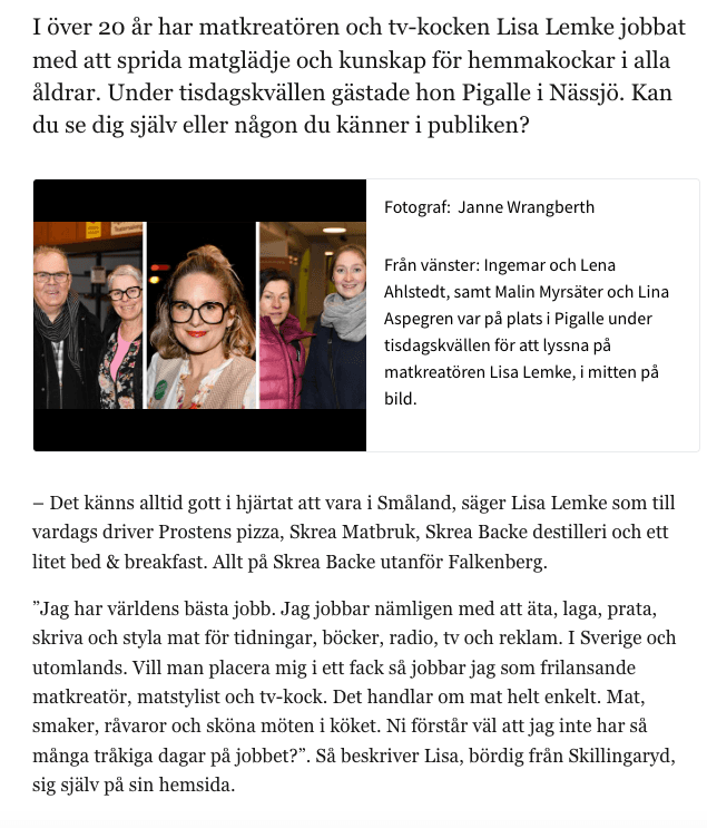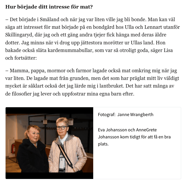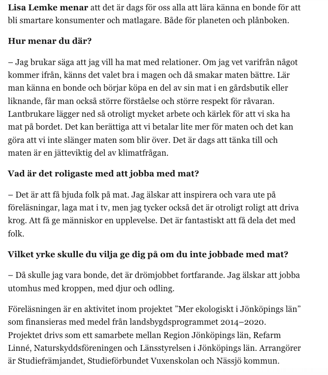 https://www.smalandsdagblad.se/2024-03-12/tv-kocken-lisa-lemke-lantbrukarna-ar-mina-superhjaltar (Låst artikel, kräver prenumeration)